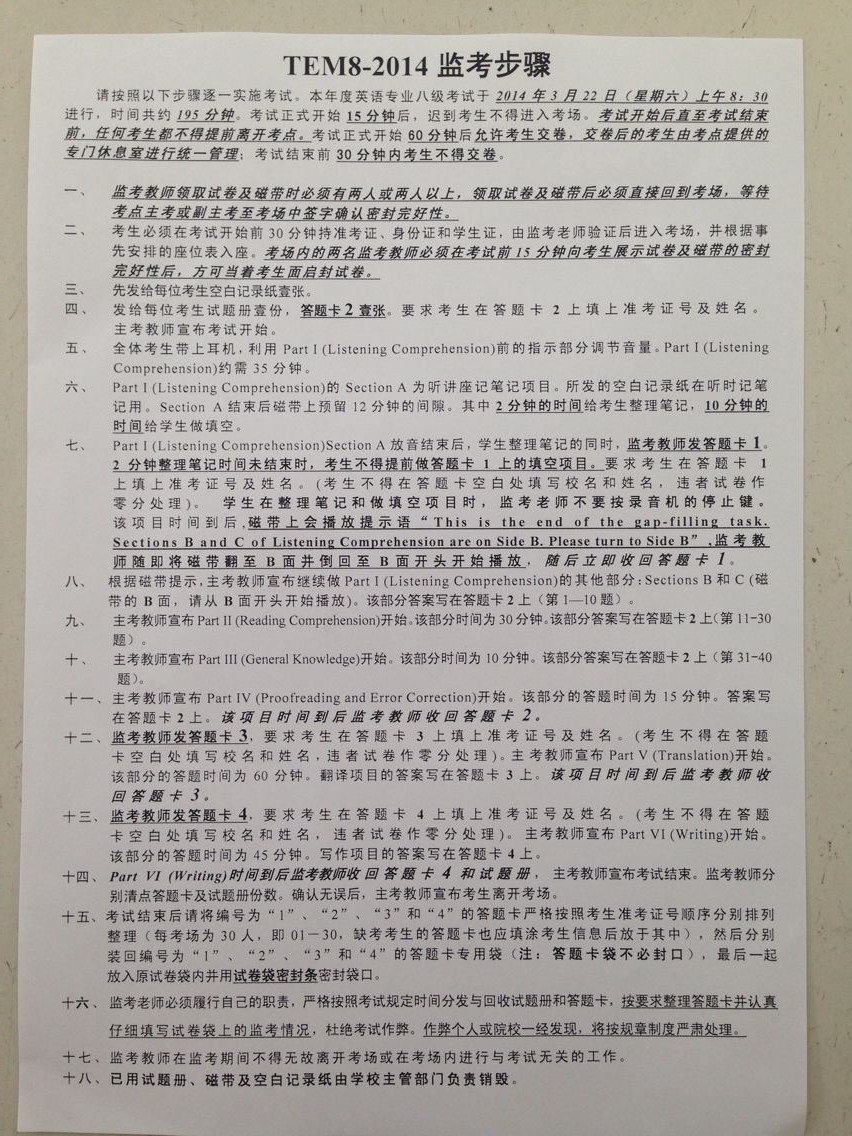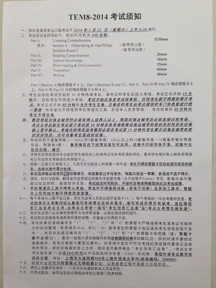 2014年英语专业八级考试将于本周六(3月22日)上午8:30在外语系举行