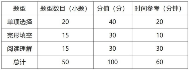 满分为100分,时间为60分钟,共3种题型50道题,全部为客观题。参赛选手不得使用任何纸质词典、电子词典和工具书。