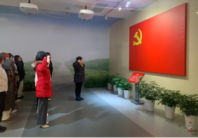 在鲜红的党旗下,党总支副书记肖琴领誓,全体师生党员重温入党誓词,庄严宣誓,他们面向党旗、举起右拳,字字铿锵,句句千钧,洪亮、激昂的声音在陈列展馆里回响,传递着党员同志们昂扬的斗志和对党的赤诚忠心。