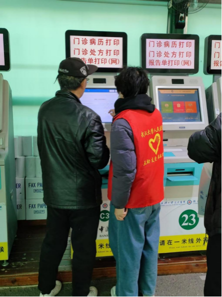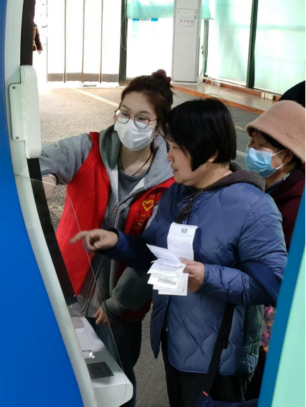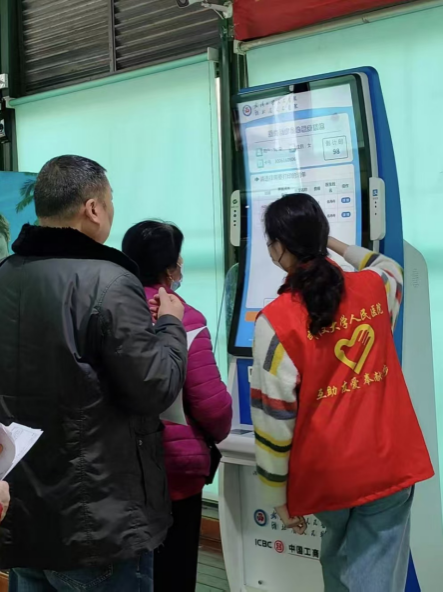 随后,志愿者们迅速投入到服务工作中。在挂号窗口前,许多患者因不熟悉流程而显得焦虑不安。英语2203班班长吴雪同学主动上前,耐心地为一位老年患者讲解挂号流程:“大爷,您别着急,我来帮您。请告诉我您需要挂哪个科室,然后出示身份证,我帮您在自助机上操作。”在她的帮助下,老人顺利完成了挂号手续。