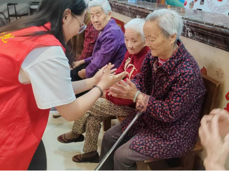 在养老院的多功能活动室内,志愿者们与老人们一同学习了一套适合老年人的保健操,并亲切地与每位老人交谈,耐心倾听他们的心声,详细了解其生活状况与需求。老人们笑容满面,主动分享故事经历,志愿者耐心回应、温柔安慰,让老人们感受到温暖。