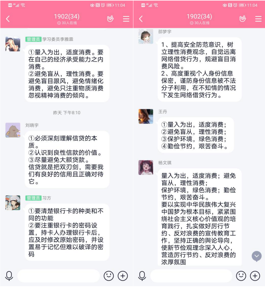 班会伊始,班长为同学们普及征信知识,金融知识,从而引导大家珍爱信用,理性借贷,理性消费,提高同学们的征信意识、金融意识、风险意识、法律意识,引导大家建立正确的消费观、荣辱观、价值观,努力培养德智体美劳全面发展的社会主义建设者和接班人。班会中分享了诸多常见的诈骗方式,以此来提醒同学们提高自我防范意识。且特别强调了现在常见的网络刷单,常常会有诈骗事件发生。同学们用言语承诺行动,用行动实践诚信,以期树立诚信学风、创建诚信校园、争做诚信学子。英语1902班全体同学在线上集体承诺——“我承诺:做人信为先,成事行为首,用我行动,守卫诚信!”,简短的话语、精炼的语言,却包含着同学们对“诚信”二字内涵的深刻理解及坚定决心。会后同学们热烈讨论、积极参与,就坚守诚信行为纷纷发表了自己的看法。