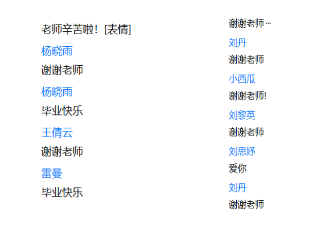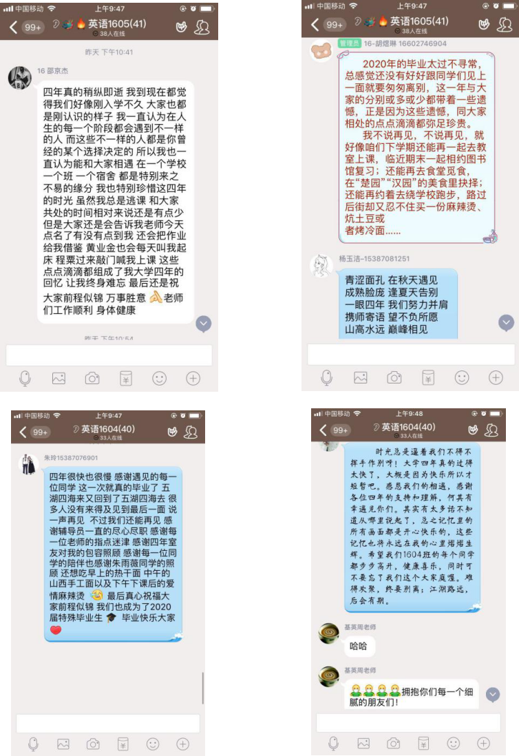 接着李莹老师提到,因为今年的疫情大家无法集体见面,无法在最熟悉的教室进行这最后一次的班会,甚至无法每个人都拥有拨穗仪式,但是四年的同窗情、师生情却不会因此有一丝丝的改变。四年就在转瞬间,仿佛昨天才刚刚入学,而今天就毕业了。武院四年的春夏秋冬承载着大家太多的欢乐与感动。她哽咽得说到:“没有在最美好的时光遇见你们,却因为遇见你们有了这段最美好的时光。希望大家毕业之后仍能带着在校时学习的那股冲劲儿与韧性,勇往直前,有时间常回家看看,风里雨里武院等你。”同学们也有感而发,纷纷在班级群发表自己的毕业感想。