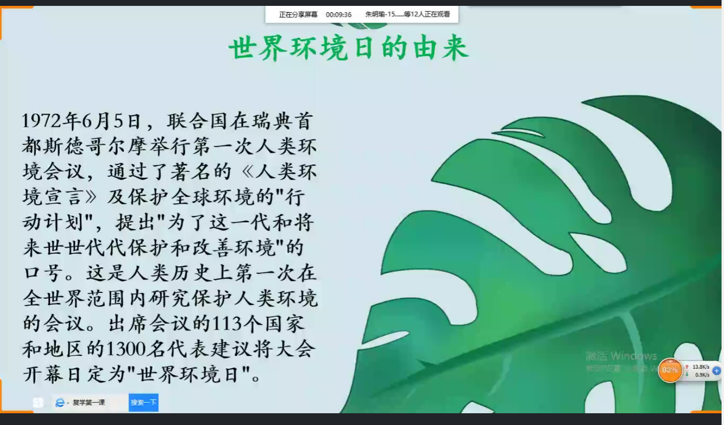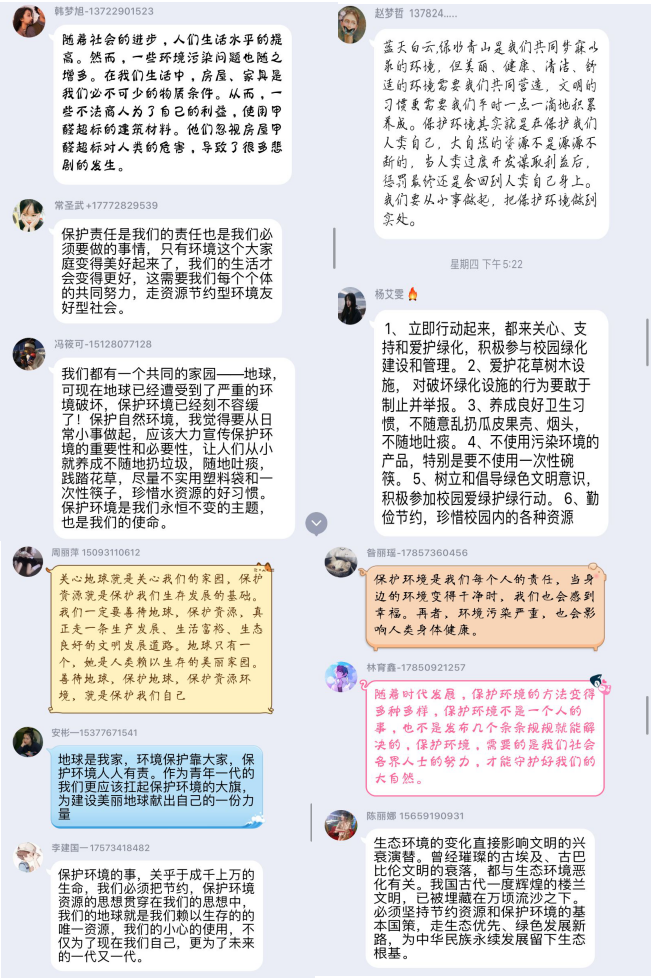 其次,主持人带领着同学们一起学习PPT内容。本次班会使得同学们知道了世界环境日的由来,世界环境日最初设立的初心,同时也让同学们了解了现在这颗星球上正在发生的事情,让同学们了解到因为人类的不注意不在乎造成的一系列大问题出现。同学们不禁发出感慨,为那些消失的物种感到抱歉和愧疚。