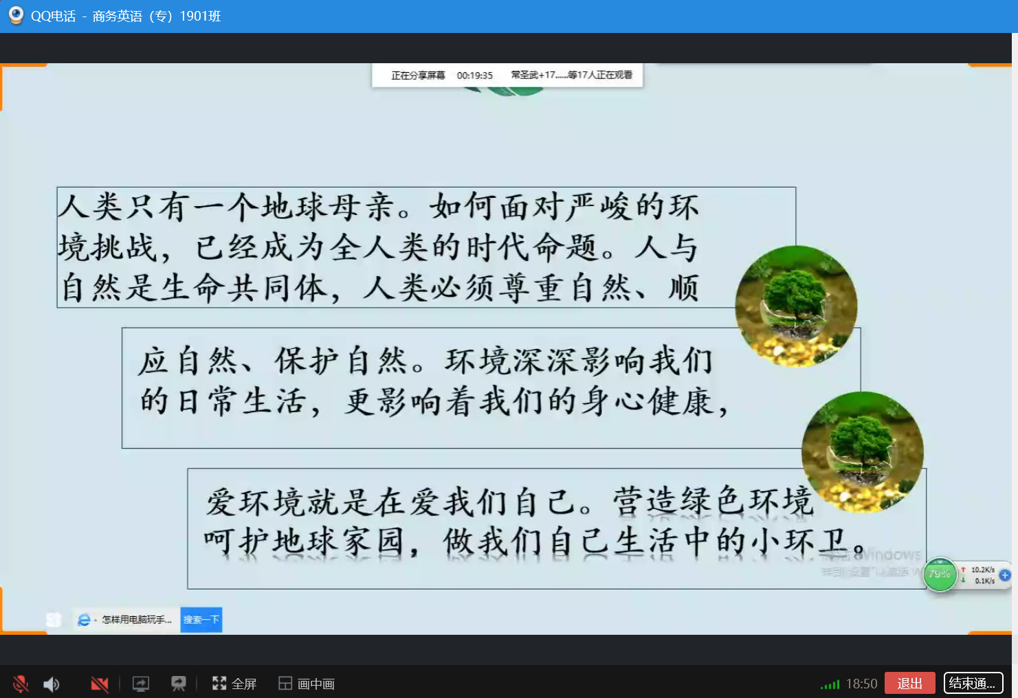 世界气候现状持续恶化已经严重威胁人类的生存和发展,人类因气候变化而对未来产生的担忧与恐慌也在逐步深化。面对这一系列环境保护问题,“低碳生活”的理念渐渐被各国所接受。同时,经济的发展,人们生活水平和人口素质的提高也使低碳生活成为了现代人急需建立的一种生活方式。为了响应国家的号召,培养我班学生的环保意识,十大赌博正规网址排名商务英语(专)1901班于6月4日开展了以“营造绿色环境 ·呵护地球家园”为主题的班会。