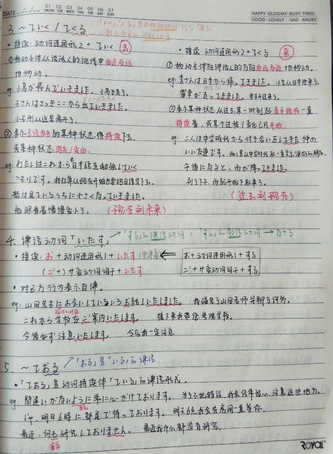在做笔记时,把老师上课提到的重点内容记下来。我主要做的是日语一些语法相关内容的笔记。个人觉得日语语法又多又杂,同一个词会有许多不同的用法,两个不同的语法却表示差不多的意义,因此这些内容就可以归纳在一起。也就是当学到新的知识点与之前学过的内容有一定联系时,就可以归纳在一起记忆,从而加强巩固对这类知识点的理解。