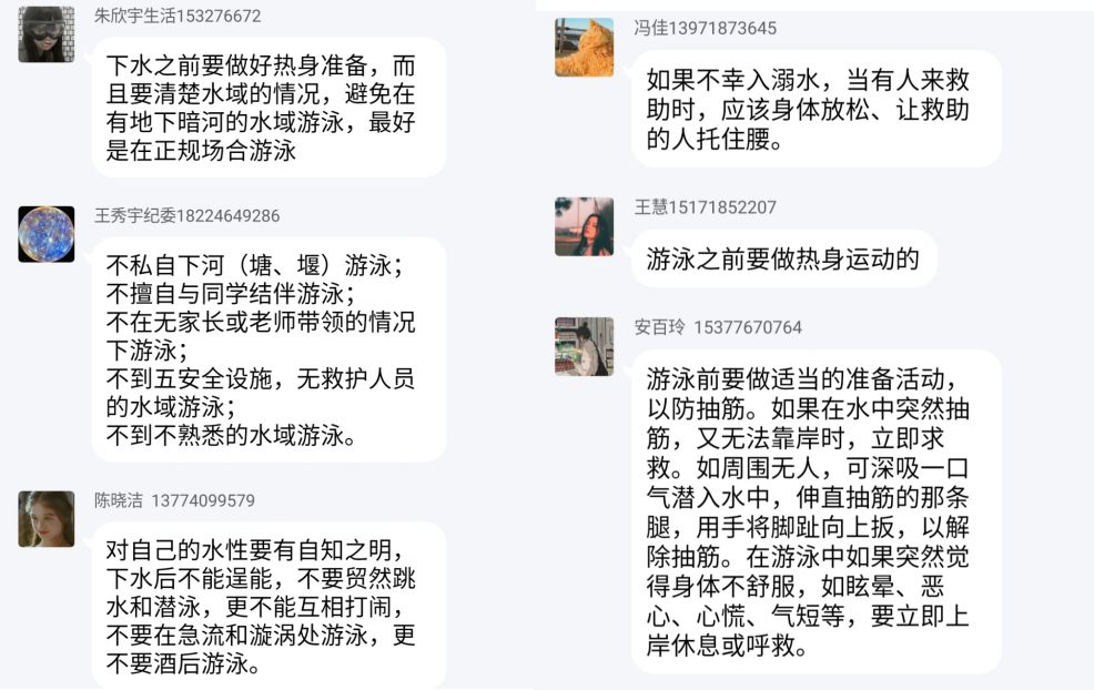 最后辅导员李莹老师对大家提出要求希望这些防溺水的知识大家永远用不到,但这节必修课我们每个人都应该补上。希望同学门能在思想上高度重视自己的人身安全,充分认识到溺水的严重性以及危害性,切实杜绝溺水事故,克服侥幸心理,维护自身安全,为自己、为家人、为社会负责。生命仅一次,溺水只在一念之间,防范溺水你我正当时。
