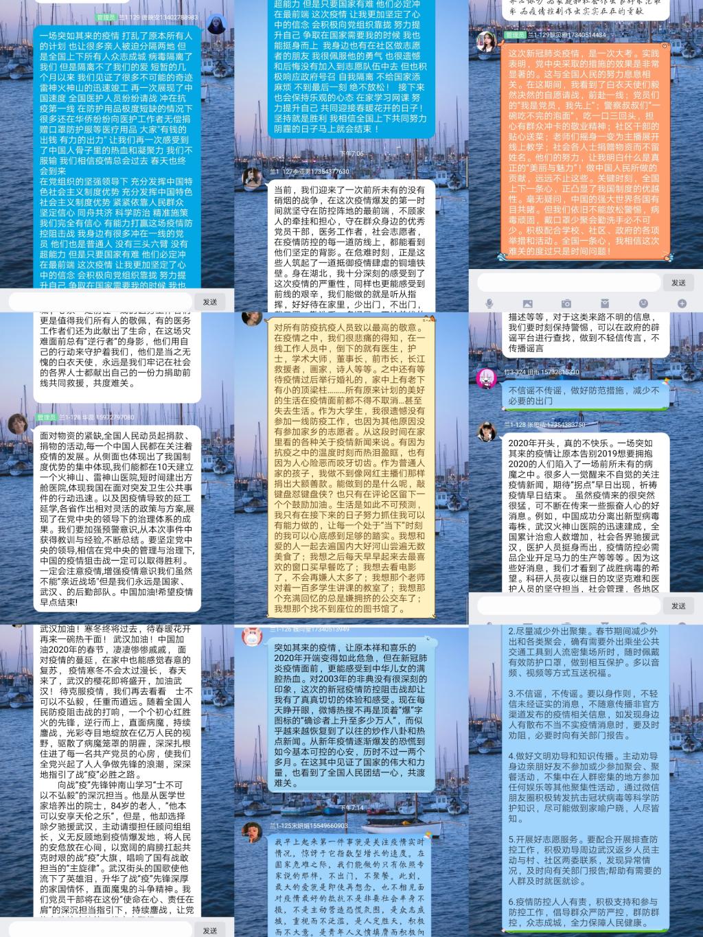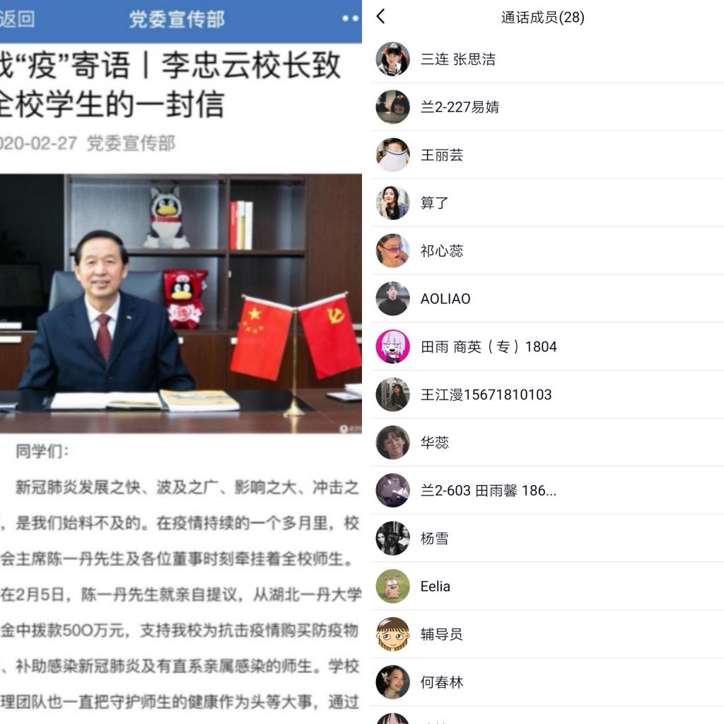 在班会最后,辅导员田离荣向同学表示了亲切的问候,并对这次班会进行了总结,组织大家线上谈自己的感悟。她表示,疫情防控期间,大家要做好卫生防护,做到不给国家添乱,安心在家上网课,向郭岳学长学习,努力践行“明德创新、解行并进"的校训精神。每个人都要理性对待,认真防护,在家多和父母沟通交流,期待疫情过后大家重聚武院。