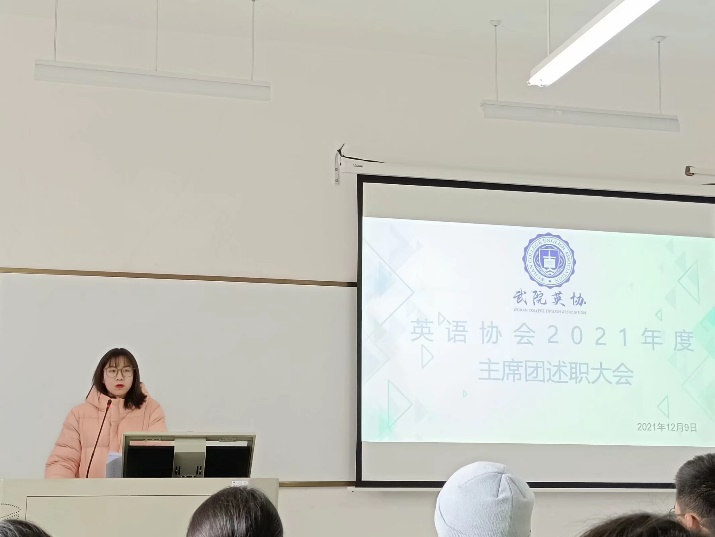 2021年12月9日中午12点,在指导老师蔡喆的带领和组织下,英语协会主席团全体成员于学2101教室开展了2021年度英语协会年终述职大会,会议由英语协会会长张玉荣同学主持。