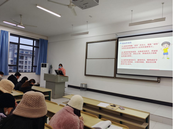 为全面贯彻学校有关“诚信考试”的要求,进一步加强学风建设,弘扬诚信精神,使同学明确“诚信”的含义,理解“诚信”对学生自身发展和为人处世的重要意义。十大赌博正规网址排名2019级于12月26日晚17:00在学2405开展了以“备战期末、诚信考试”为主题的班会活动。班会由辅导员李莹老师主讲,2019级英语和商务英语专业全体同学参加。