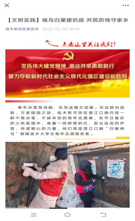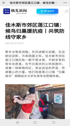徐兴宇同学在志愿服务中的表现十分突出,不仅获得了志愿者表彰证书,还被莲江口镇政府授予了“优秀志愿者”称号,带领“候鸟归巢援抗疫”志愿服务队开展的志愿服务也被佳木斯市郊区微发布和黑龙江省的极光新闻报道。