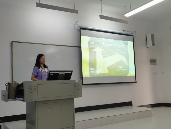 接着她就同学们上个学期的各科成绩进行分析,成绩不理想的科目,提出自己的建议,成绩较好的科目提出表扬并希望同学们继续努力。关于是否要考研,这个让同学们感到迷茫的问题,她提出了自己的见解,认为考研与找工作两者并不冲突,并就如何准备和选择要报考的学校,向同学们进行了详细的讲解。