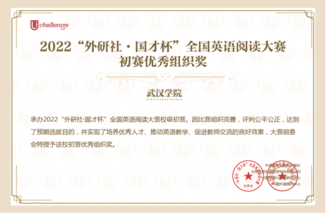 “外研社·国才杯”全国英语阅读大赛为我校学生提供了一个展示和交流的平台,磨砺学生语言技能,鼓励深度思考,有助于培养学生语言、思辨、跨文化沟通及分析解决问题等多种能力,有效激发了学生学习英语的热情。同时,大赛秉承“以赛促学,以赛促教”的宗旨,为我校参加“外研社•国才杯”全国英语阅读大赛湖北省赛区复赛选拔了优秀选手,赛事对新时代人才在英语阅读能力方面提出的挑战与要求也为我校英语阅读教学指明了方向。