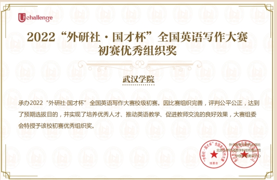 2022“外研社•国才杯”全国英语写作大赛是外研社Unipus为全国大学生打造的展现风采、实现自我的赛事平台。英语写作能力是国家未来发展对高端人才的基本要求,也是高端人才外语能力、思辨能力、交际能力、创新能力和国际竞争力的综合体现。本次比赛融入了思辨性、拓展性和创造性等关键要素,有助于丰富我校英语第二课堂活动,激发学生英语学习热情,提升学生英语综合应用能力,增强跨文化交际意识,开拓国际视野,提升国际素养。
