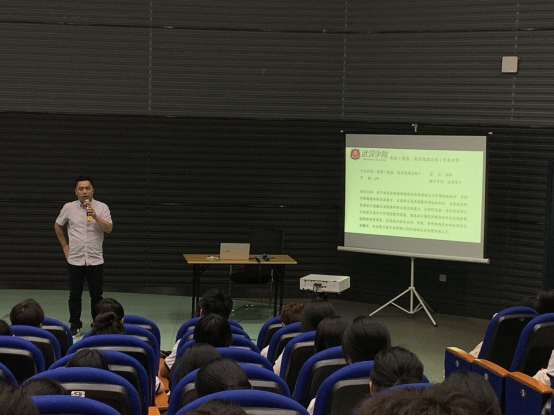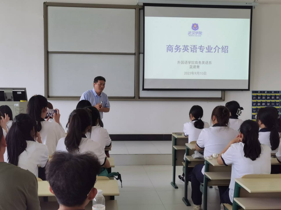 商务英语系系主任蓝建青从商务英语系简介、人才培养方法、人才培养成效以及学习的几点建议分别向本、专科学生进行了有针对性的介绍。他帮助新生梳理专业学习的重点和计划,有效解决了新生的专业困扰。蓝老师还邀请同专业高年级学习标兵在专业介绍会上向新生分享学习和生活经验,拉近同学们之间的距离。