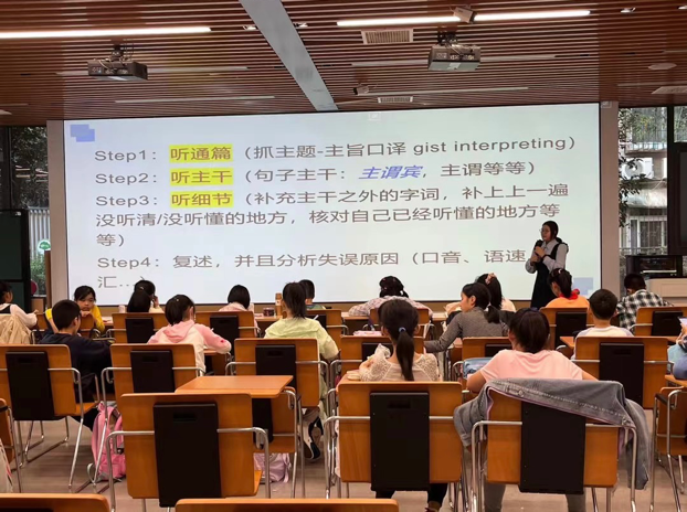 宣传部部长王壹涵主持的口译听力是“少年口译队”课程中的重要一课,她将听力内容进行拆分,带领小队员们进行泛听精听,教授口译听力技巧帮助大家快速抓住文章主旨。面对较难的听力文段,鼓励同学们大胆尝试并耐心解答听力过程中出现的问题。