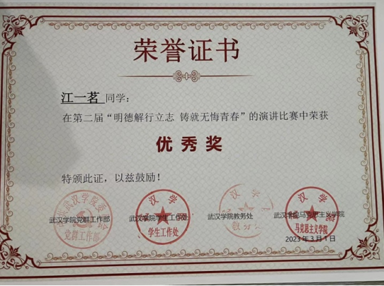 一入学,江一茗便郑重地递交了入党申请书,积极向党组织靠拢,通过一年的学习和考核,她成为了一名积极分子并时刻按照党员的标准来要求自己。“行有为之事,做有为青年。”江一茗在学生干部培训会上如是说。作为一名学生干部,她时刻谨记,要提高思想觉悟水平,严格要求自己,戒骄戒躁,以身作则,认真参加学校及学院组织的各项活动。她相信“有志者,事竟成,破釜沉舟,百二秦关终属楚”,信仰和目标,缺一不可。