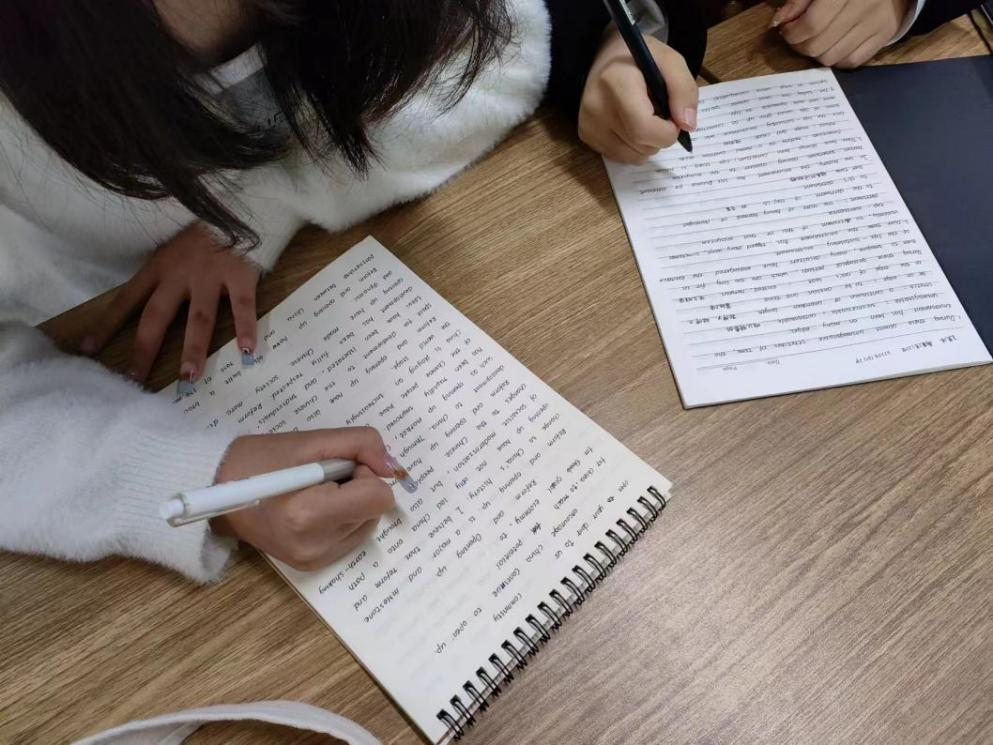 英语写作技巧交流小组主要围绕四级历年真题中的话题作文展开针对性学习。他们分析了范文中的写作技巧,并写下相关的词、句以及一些好的表达。负责人夏金铭提到:“我们在写真题中遇到过有关科技利弊分析的作文,也有关于邀请信、组织报告活动类的作文,发现四级作文大多数和议论、生活、实用性紧密相关。所以,我们小组也据此收集了相关作文材料。本月的四级作文学习使我们明白学习不仅仅是吸收的过程,更是将其理解并总结,最终举一反三达到事半功倍的过程。”