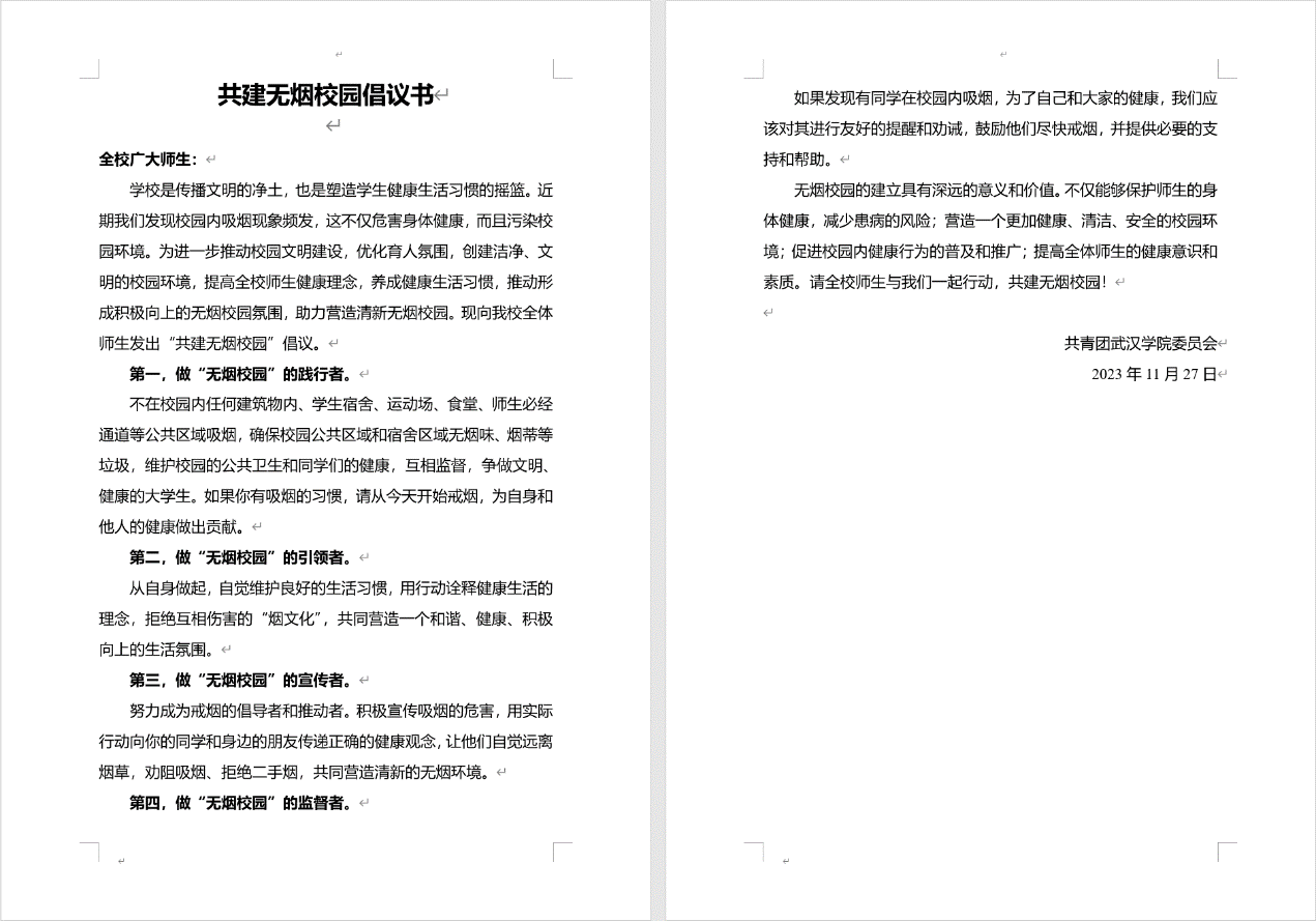 十大赌博正规网址排名团学联提出建设无烟校园倡议。倡导全体学生养成健康生活习惯,互相监督,远离香烟,拒绝二手烟,共同营造清新的校园生活环境。