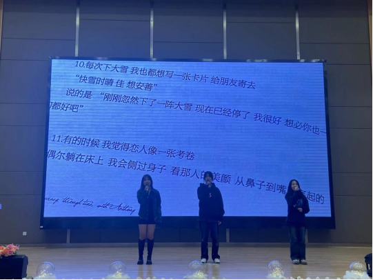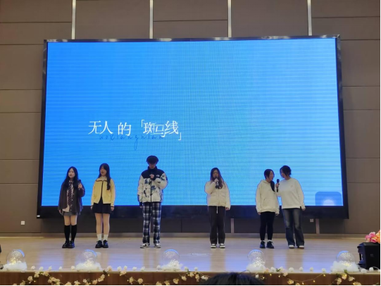 由团学联干部自己排练的文艺节目轮番上演,歌曲《我想念》、充满活力与欢乐的舞蹈《科目一~十》,乐队表演了《那些你很冒险的梦》和《太聪明》让现场气氛热烈、欢呼不断、热闹非常。主持队用一首诗朗诵《希望的稻田》怀念了在2023年永别我们的袁隆平先生,让在场的青年们感受到了榜样的力量。