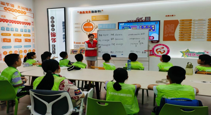 在华锦社区英语单词课上,队员李华怡引领着学生们通过一首欢快的水果歌曲进入学习状态,让大家在旋律中结识了众多水果的英文词汇。随后,通过一场“水果蹲”的趣味游戏,增强了课堂的互动性,还加深了孩子们对所学水果单词的记忆与理解。每一个新词汇的掌握,都像是打开了一扇通往世界的窗户,让孩子们的好奇心和探索欲在知识的阳光下茁壮成长。