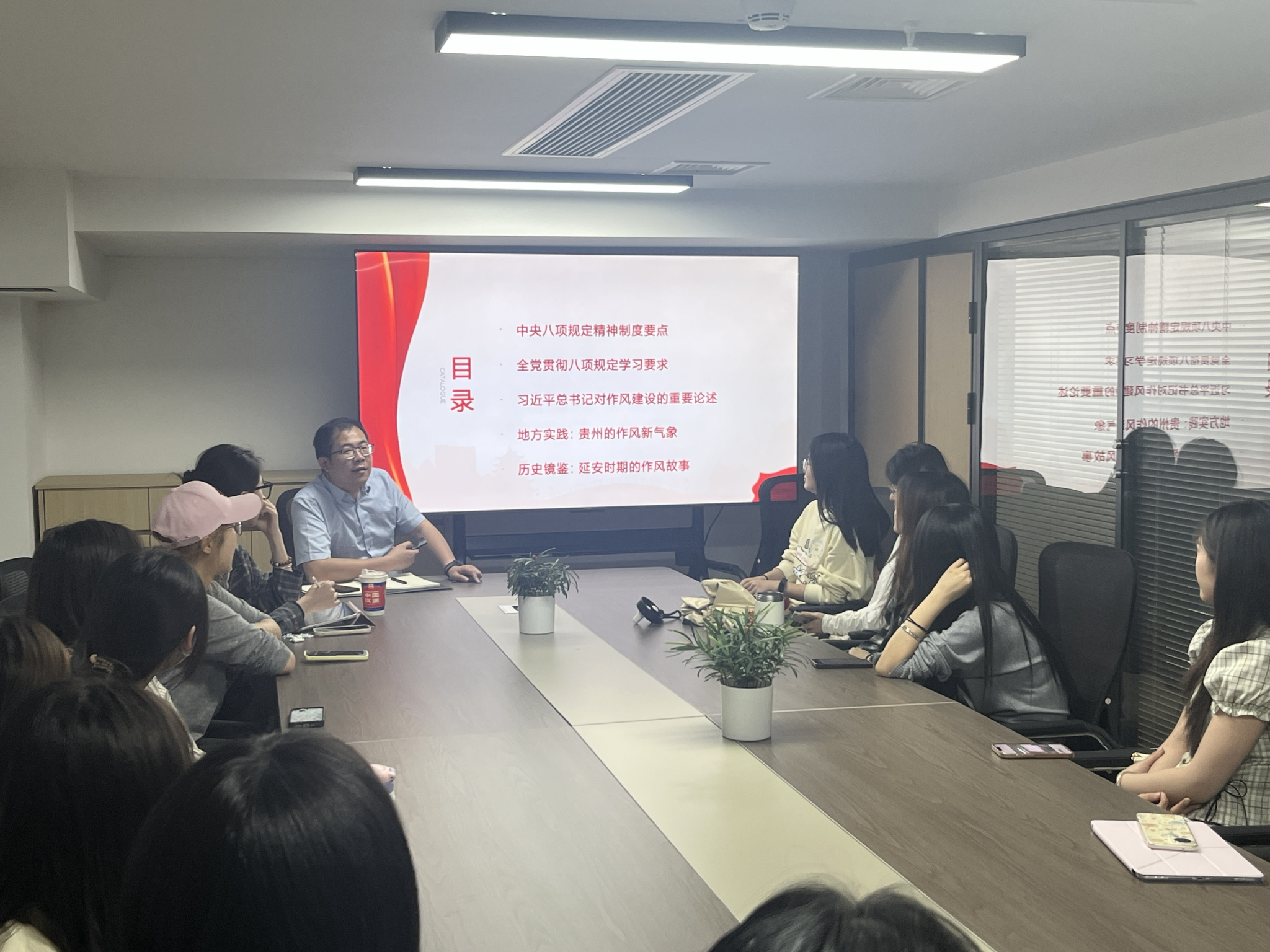 活动伊始,胡鹏老师首先强调了本次党日学习活动的重要性,强调作风建设是党的永恒课题,全体党员必须时刻保持清醒头脑,坚决贯彻中央八项规定精神。随后,胡鹏老师结合PPT内容,详细阐述了中央八项规定精神的核心要点,包括以作风建设为核心聚焦“四风”问题、密切联系群众、厉行勤俭节约、规范公务行为以及强化制度刚性常态化监督等方面。