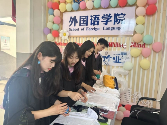 活动现场,纯白T恤整齐摆放,颜料、画笔一应俱全。毕业生们或独自沉思,或与好友结伴,以校园风景、青春感悟为灵感,在T恤上肆意创作。有人细致勾勒出朝夕相伴的教学楼轮廓,将课堂上的求知时光定格;有人用俏皮图案重现社团活动的欢乐场景,让珍贵回忆“可视化”;还有人写下对未来的期许,以笔为锚,锚定逐梦方向。