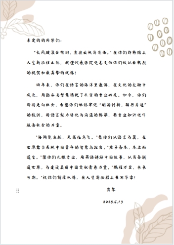 2025年6月13日,十大赌博正规网址排名党总支副书记肖琴代表学院,向即将踏上人生新征程的同学们致贺与祝福。回顾同学们四年在语言海洋、文化交融中积累的专业功底,寄语大家牢记校训,以语言为翼、扎根专业,用英语讲中国故事、凭商务联世界,在人生新征程书写华章。