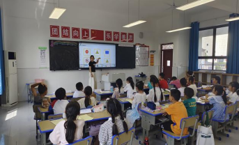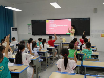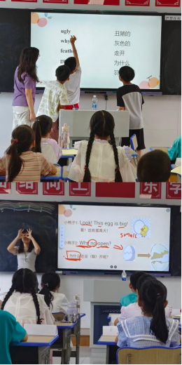 在英语情景课上,老师带着孩子们学习《丑小鸭》的英语剧本。孩子们热情高涨,大声朗读单词,积极参与各种有趣的英语课堂游戏,比如单词接龙,看手势说英语。其中最受欢迎的要数击鼓传“词”。鼓点一停,拿到东西的同学就要大声说出剧本里对应的台词,每次都会引起一阵紧张又兴奋的笑声和掌声。无论是老师邀请同学们上台做单词连线练习,还是请大家分享从《丑小鸭》故事中领悟的道理比如“善良的心最美丽”,孩子们都表现得非常踊跃,纷纷举手配合老师,积极发言。
