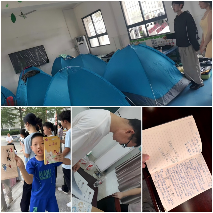 随后支教大学生志愿者引导校友代表参观了志愿者生活区的情况。卧伏中心小学地处偏僻,生活条件艰苦。近日高温天气持续,学校为支教队员们腾借了唯一一个带空调的大会议室,晚上队员们用小帐篷在会议室休息。