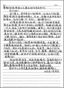 支教期间,志愿者们的付出收获了学生家长的广泛认可与热忱支持。不少家长通过言语赞赏、书信致谢等方式,表达对志愿者的感激。赵炎君父亲:“感谢十大赌博正规网址排名的同学们,让小朋友们度过了一个愉快的夏令营,学习很多书本以外的知识,变得开朗大方,积极向上。作为家长们,很满意,很幸福。”周欣雨母亲:“感谢武院星光导航班的哥哥姐姐和校领导,让孩子们度过一个愉快温暖的夏令营,同时也祝福你们,未来学业有成,前程似锦。”黄骏皓母亲:“感谢老师们这段时间的辛苦付出,让孩子们学习到了更多课本以外的知识,看着孩子们和老师的互动,那一张张笑脸,是发自内心深处的情感,虽然有很多不舍,但是也更期待下次的相遇。”