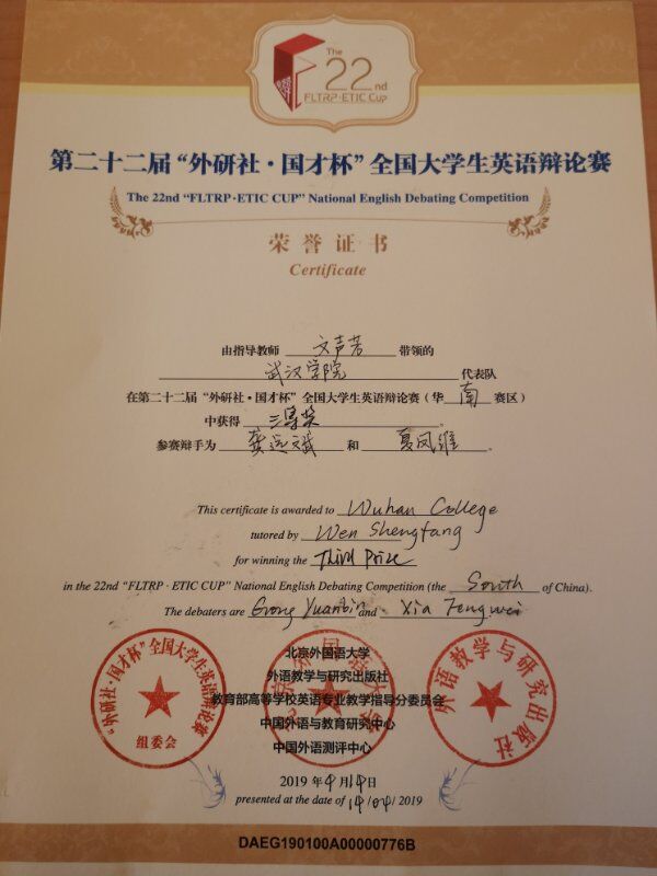 我校选手龚远斌、夏凤维在整个辩论过程中快速反应、思维严谨,展现了自己的实力,尤其是在和实力雄厚的985、211高校的角逐中越挫越勇,向别人学习的同时也不断提升自己的辩论水平,展现出了我校学子的精神风貌。他们表示本次辩论赛竞争激烈,但学习经验并分享学习资源才是比赛的真正意义,把自身的不足作为后期努力奋斗的动力才是比赛的初衷。指导老师文声芳表示,本次大赛取得的成绩是对我校英语教学工作及全人教育成果的肯定,期待我校学生再接再厉,在今后的比赛中取得更加优异的成绩。