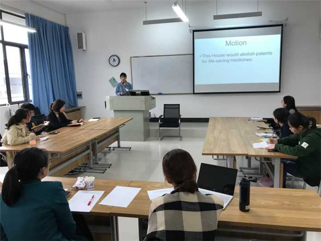 本次比赛初赛从2018年12月开始宣传筹备,吸引了来自全校不同专业的30多名同学报名参赛,经过初赛的即兴演讲环节,晋级的16名选手参加了3月21日下午于学院楼2301举办的复赛。辩论赛采用英国“议会制”辩论形式,选手提前15分钟进行抽签,主席公布辩题,大赛分别抽取了辩论赛组委会提供的两个选题:This House would subsidize mother tongue education for large immigrant groups 和This House would abolish patents for life-saving medicines,选手们从辩题入手,正反双方展开激烈角逐。