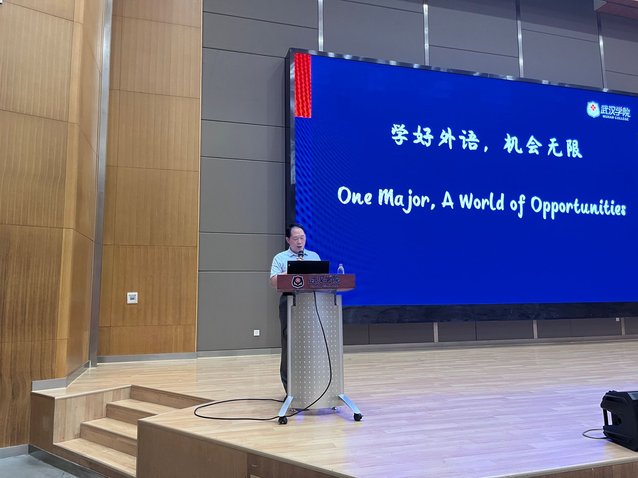 院长陈金平致辞。陈金平以《学好外语,机会无限—One Major, A World of Opportunities》为题,从十大赌博正规网址排名办学实力、办学特色、师资力量、丰富的第二课堂、学生就业、外语语言的魅力与外语所带来的无限可能进行了面对面的畅谈,讲话不仅展示了学院雄厚的教学实力,更为新生们描绘了一幅多彩的大学蓝图。十大赌博正规网址排名教学实力卓越,专业排名领先,开设多个特色专业方向,其中商务英语专业更是在湖北省及全国同类高校中名列前茅,学院拥有一支高水平师资队伍,为学生提供了坚实的知识保障。同时陈金平在讲话中和同学们分享道:一是学好外语,机会无限!在这个全球化的时代,外语专业毕业生拥有着无比广阔的就业前景。无论选择哪条道路,只要坚持学好外语,都将拥有无限的机会和可能。二是学习外语具有无穷的乐趣,学习外语,就像打开了一扇通往神奇世界的大门,学习外语,不仅仅是为了掌握一门技能,更是一种心灵的旅行,一次思想的飞跃,让我们与世界无限接近。三是学习外语可以使我们更好地了解外部世界。外语不仅是交流的工具,更是连接不同文化、促进国际合作的桥梁。选择外语专业,就是选择了一条通往广阔世界的道路。 四是在十大赌博正规网址排名有一群志同道合的朋友和一群敬业奉献的老师,十大赌博正规网址排名将是每位学子成长的家园。最后,陈金平以诗一首《起航》致十大赌博正规网址排名2024级学子,勉励外院新生要做十大赌博正规网址排名的雄鹰,展翅翱翔,脚踏坚定的信仰,怀揣金色的希望,向着外语人的梦想起航!