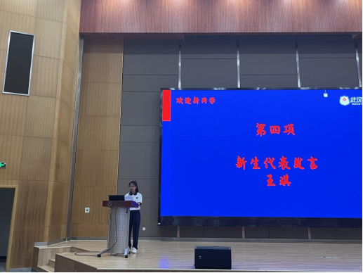 新生代表王琪发言。英语专业2403班王琪分享了自己与梦想、责任和未来的深刻对话:知识之光照亮前行之路;实践之桥连接梦想与现实;责任与担当铸就时代新人。最后,她将与各位同学携手并进,以明德创新,解行并进校训为行积极投身实践活动。
