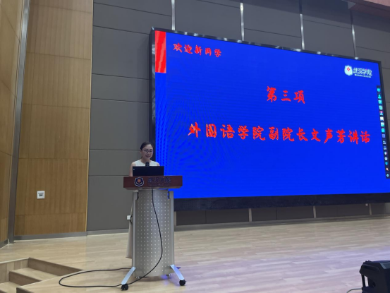 副院长文声芳讲话。文声芳以“过去、现在、未来”三个关键词,从对学子们过往辛勤付出的肯定、立足当下的要求、未来的寄予厚望三个方面深情而有力地表达了对学子们的殷切寄语,为在场的每一位外院学子注入了新的鼓舞与力量。文声芳高度赞扬了学子们过往的辛勤耕耘与辉煌成就,强调正是这些努力铸就了现在的“我”,勉励学子们要珍惜当下,坚持初心,不忘传统,不随波逐流,以坚定的信念和不懈的努力迎接每一个挑战,对于未来,她鼓励大学生们勇于担当起时代赋予的重任,成为国家发展的中坚力量,民族的希望之光。最后她强调,作为新时代的青年,大学生们应回望过去以铭记初心,立足当下以珍惜时光,眺望未来以勇于担当,共同在大学这个广阔舞台上绽放青春光彩,携手书写属于自己的辉煌篇章。