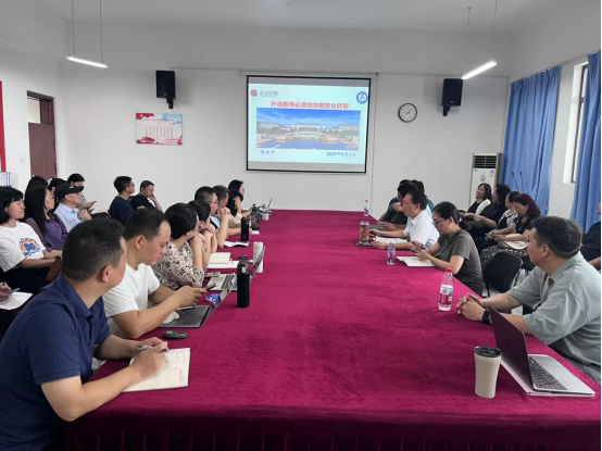 而后,陈金平分析了学院在大学英语、外语专业面临的双重挑战,在大学英语教学方面,尽管四级通过率有所上升,但学校在“十五五”期间高质量发展、国际化及申硕工作对学生的外语水平有更高的要求,并且四级通过率逐步进入瓶颈期,亟须借助新手段实现突破。在外语专业发展层面,受社会经济形势变化以及教育部学科专业设置调整优化相关政策的影响,外语专业面临着学科调整与社会认同的双重压力。面对挑战,陈金平明确指出“教师转型、数智赋能” 是学院的突围之路,当前形势下,教师数智化转型已不是选择题,而是生存题。民办高校赛道已从“马拉松” 升级为 “星际竞速”,唯有抢先拥抱AI,才能占据发展先机。教师数智化转型发展,既是应对外部变革的必然选择,也是驱动学院内涵发展的核心引擎,更是落实学校“十五五”规划的根本保障。