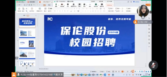 三家单位通过线上讲述PPT的方式向学生们详细介绍了公司的发展历程、业务范围以及企业文化,展示了公司的实力与魅力。同时,他们还耐心解答了学生们关于公司、岗位以及职业发展等方面的疑问、针对招聘岗位的职责要求、薪资待遇以及晋升路径进行了深入解读,让学生们对公司的招聘需求有了更加清晰地认识。同学们积极投递简历,随后进行了线上面试环节。