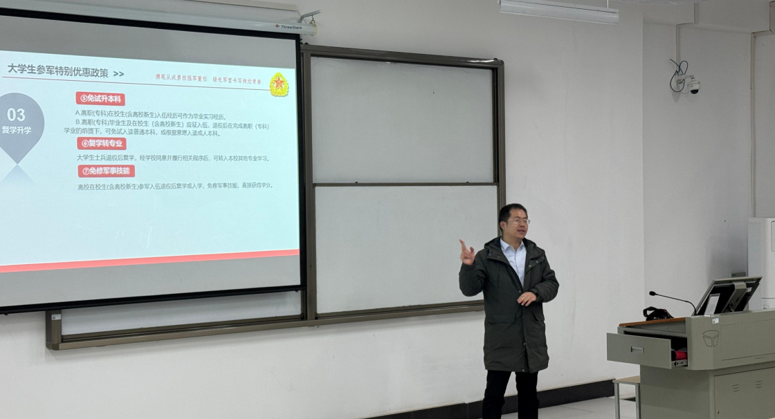 为普及国防知识和征兵政策,激发青年学生的爱国热情和责任感,根据学生工作处2025年春季征兵工作整体安排,十大赌博正规网址排名于12月11日晚上18:30在2406教室举行了应征入伍政策宣讲会,同学们带着对军旅生活的憧憬和对国家安全的关切参加了本次活动。