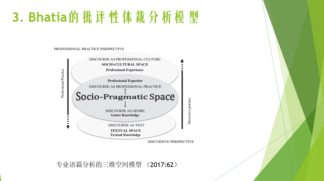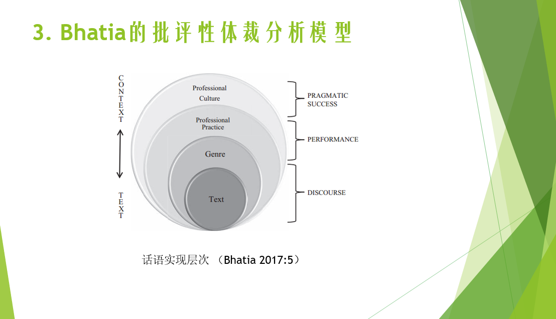 首先,孙老师老师为大家介绍了Bhatia于2006年在一次话语分析的圆桌会议上提出批评性体裁分析(CGA)的概念,并在2017年出版专著Critical Genre Analysis: Investigating Interdiscursive Performance in Professional Practice。以此专著的发行为标志,Bhatia的CGA理论已形成一个成熟的系统的理论体系。在Bhatia(2017)的CGA理论中,她认为话语分析的四维度多视角分析模型,将语篇与语境、话语实践与专业实践融合在一起,建议多角度多方位理解分析语篇,其分析模型详见下图。