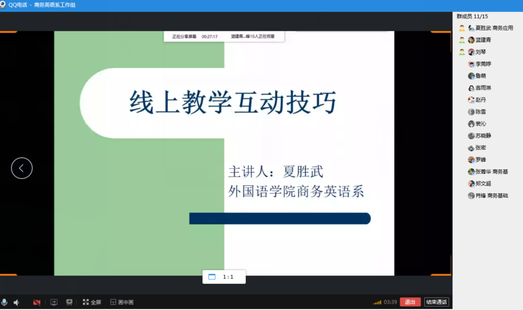商务英语系的本次科研工作坊活动由系主任夏胜武老师主讲,主题为“线上教学互动技巧”。商务英语系全体教师参加了本次工作坊活动。