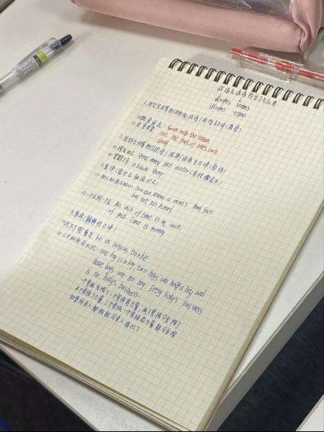 在成语与谚语翻译技巧讲解课上,执训官张瀚允在紧张与期待中迎来了第一次正式执训。一周之前,她就已经准备好了详细的课程活动计划。执训当日,张瀚允、王语嫣早早到达执训教室,提前进入教室的小队员们积极地同他们打招呼。在轻松愉快的氛围下,课堂活动进行地有条不紊。到了课堂游戏环节,小队员们踊跃举手参与。课堂期间,部分小队员还向张瀚允展示他们的课堂笔记,稚嫩的文字难掩洋溢的热情。通过本次执训活动,张瀚允认识到,口译执训其实并不是单方面的传授,而是双方的协同共进。