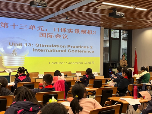 在国际会议实景模拟课堂中,小队员们在王瑶琴的带领下体验了主持人、发言人以及译员的角色。“小朋友们在实战环节非常的热情,甚至是回味无穷!”实景模拟训练不仅能让小队员们更好地运用所学习的口译知识,而且能够在课堂上感受译员职业的魅力。