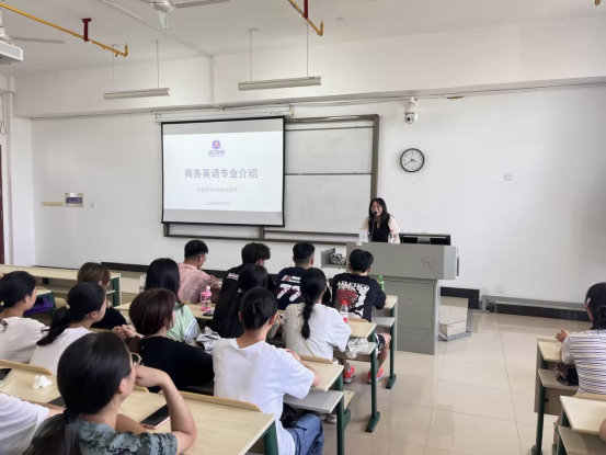 商务英语系主任蓝建青在中3503面向全体商务英语本科学生进行了专业介绍。蓝老师从商务英语专业的发展历程、师资力量、人才培养方案、优秀毕业生、校园活动等方面进行了介绍,并向同学们提出了学习建议。商务英语专业作为学校的八个省级一流本科专业建设点之一,在2024年软科中国大学专业排名中,在所有开设商务英语专业的院校中列144位,在省内同类院校中名列前茅。专业师资力量雄厚,高级职称教师占比近50%,课程体系全面对标国家标准和市场需求,知识、能力、素质协调发展,理论教学体系和进阶型的实践教学体系协同发力,培养应用型国际化商务外语人才。专业毕业生就业率高,在跨境电子商务企业、政府机关、中小学校、考研高校表现优异,就业前景明朗。蓝老师勉励新生做好大学生涯设计,制定切合实际的目标,努力完成专业课程学习,积极参加校内外学科竞赛,利用好学校国内外访学机会,全方位提高自身的能力和素质,实现自己的人生目标。最后以习近平总书记的一句话与全体新生共勉:“心中有阳光,脚下有力量,为了理想能坚持、不懈怠,才能创造无愧于时代的人生。”