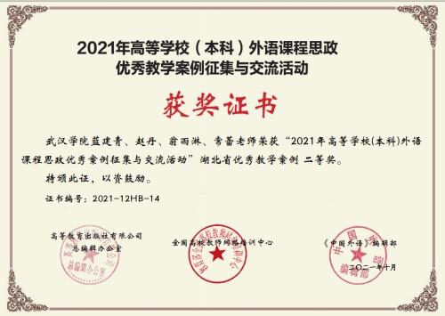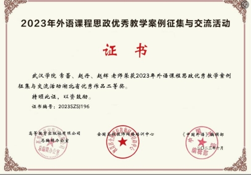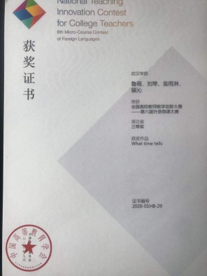 近年来,多名教师获得教学大赛奖项,先后在高教社外语微课大赛、高教社外语微课大赛湖、首届全国高等学校外语课程思政教学大赛全国外语课程思政优秀案例征集与交流活动取得多项佳绩。