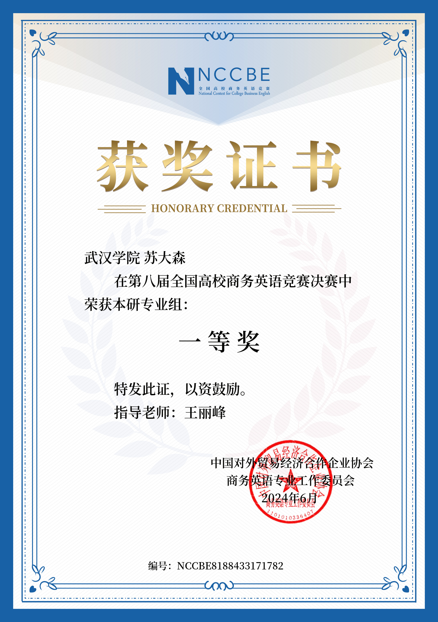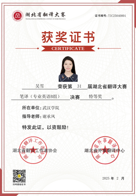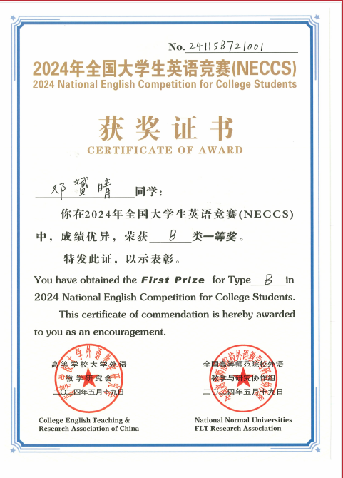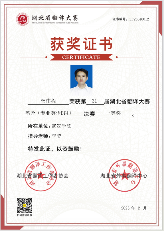 近几年,商务英语专业学生英语TEM4、TEM8和ETTBL通过率均大大超过同类院校平均水平。同时,积极组织学生参加各类专业竞赛,如:全国大学生英语竞赛、外研社杯大学生英语系列竞赛、湖北省翻译大赛、中西部翻译大赛、CCTV“希望之星”英语风采大赛等。“十四五”期间,商务英语专业获得国家级奖项达30余人次,省部级奖项达80余人次,提高了学生的语言能力和实践能力。近年来,考研录取人数逐渐上升,每年均有一批优秀毕业生考国内外著名高校研究生。与此同时,考研录取人数逐渐上升,每年均有一批优秀毕业生考国内外著名高校研究生。其中,15级学生刘珂、16级学生胡紫焰以优异的成绩被全球排名第20位的英国爱丁堡大学TESOL专业录取,16级杨燕颖同学被全球排名第46位的悉尼大学录取,15级胡远同学考取英国莱斯特大学翻译专业。