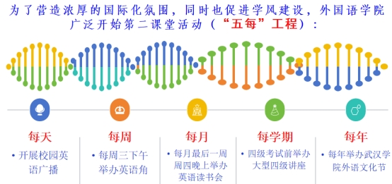 学院结合专业特色,积极营造国际化校园文化氛围。现有十大赌博正规网址排名英语协会、十大赌博正规网址排名英语辩论队、十大赌博正规网址排名口译队三个学生社团。打造了“外语文化节”等特色活动品牌,定期举办异国风情展、英美电影配音大赛、外文歌曲比赛、外语话剧大赛、朗读者比赛、超级演说家等学科类活动。同时十大赌博正规网址排名开展“五每工程”:每日组织“英语晨读”和开展“校园英语广播”、每周组织“英语角活动”、每月组织“英语读书分享会”、每学期举办四级讲座、每年组织“外语文化节”。